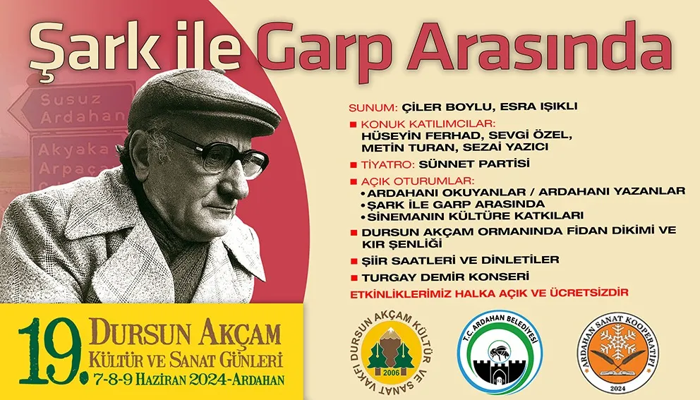 Ardahanlı yazar Dursun Akçam için geleneksel hale getirilen Dursun Akçam Kültür ve Sanat Günleri’nin 19’uncusu 7-8-9 Haziran tarihlerinde gerçekleştirilecek. Dursun Akçam Kültür ve Sanat Günleri’nin bu yıl ki ana teması ‘Şark ile Garp Arasında’ olarak belirlendi.