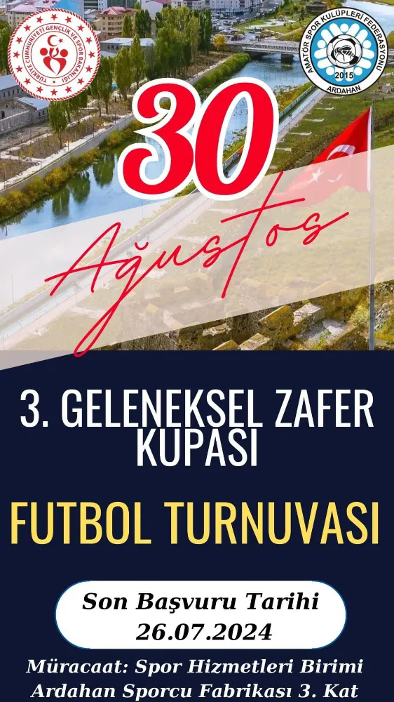 Gençlik ve Spor İl Müdürlüğü ve Ardahan Amatör Spor Kulüpleri Federasyonu (ASKF) işbirliği ile 30 Ağustos Zafer Bayramı etkinlikleri kapsamında tüm vatandaşların katılabileceği 2’inci 30 Ağustos Zafer Bayramı Futbol Turnuvası (Zafer Kupası) düzenlenecek. 15 Temmuz tarihinde başlayan turnuvaya katılım başvuruları 26 Temmuz Cuma günü mesai bitimine kadar devam edecek. Katılım başvuru formu Sporcu Fabrikasından temin edilecek.