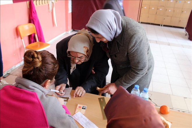 Ardahan´da 97 yaşındaki Muhlise Nine, kızı ve torunlarının yardımlarıyla oy kullanmaya geldi.