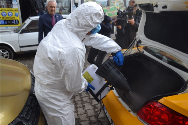 Ardahan Belediye Başkanı Faruk Demir, dezenfekte çalışmasına bizzat katılarak, giydiği özel kıyafetle Belediye taksi durağı ve taksi içerisinde ilaçlama çalışması gerçekleştirdi.