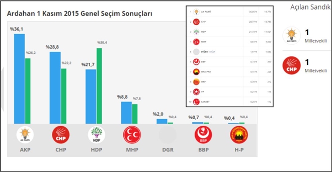 Ardahan´da AK Pati Birinci ve CHP ikinci Parti olurken birer milletvekili meclise gönderdiler. HDP ise Ardahan´da beklediğini bulamadı. Seçmen birkez daha Ardahan´da Orhan Atalay dedi.  CHP ise Konsolos ile HDP´den yerini geri aldı. Böylelikle Ardahan nin haritadaki rengide değişmiş oldu. MHP ise Osman Nuri YILDIZ ile ülke genelinde sadece Ardahan´da oyunu artırdı.