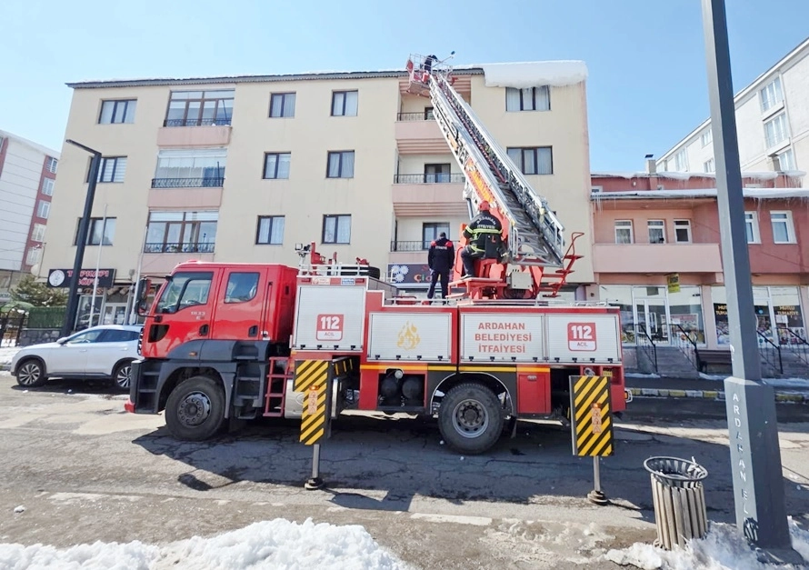 Ardahan Belediyesi İtfaiye ekipleri, kent merkezindeki binaların çatılarındaki kar ve buzları temizleyerek vatandaşların can güvenliğini sağlıyor.