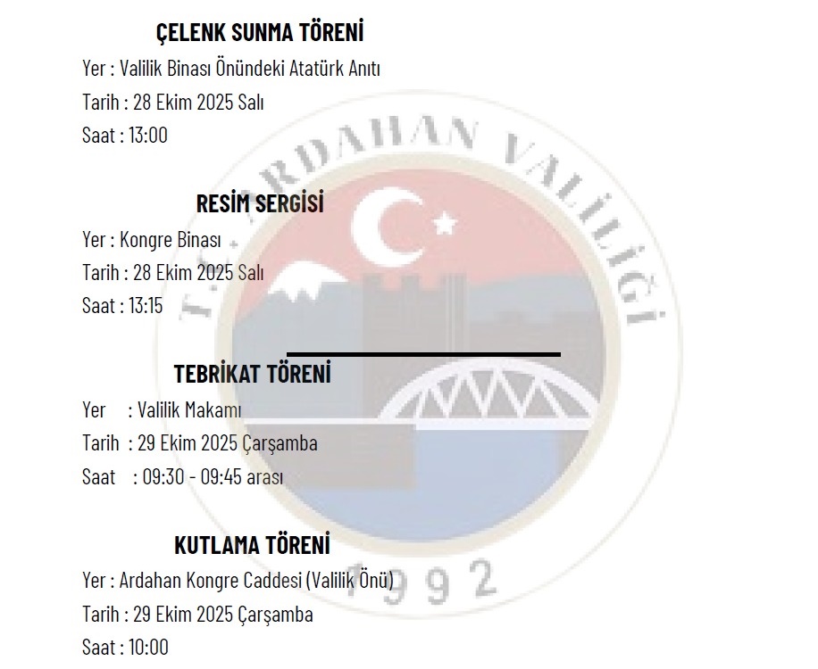 Kutlama programı ise saat 10.00’da Kongre Caddesi Valilik önünde yapılacak törenle devam edecek. Ardahan Valiliği tarafından yapılan açıklamada, tüm Ardahan halkı ve basın mensupları Cumhuriyet Bayramı coşkusuna ortak olmaya davet edildi.