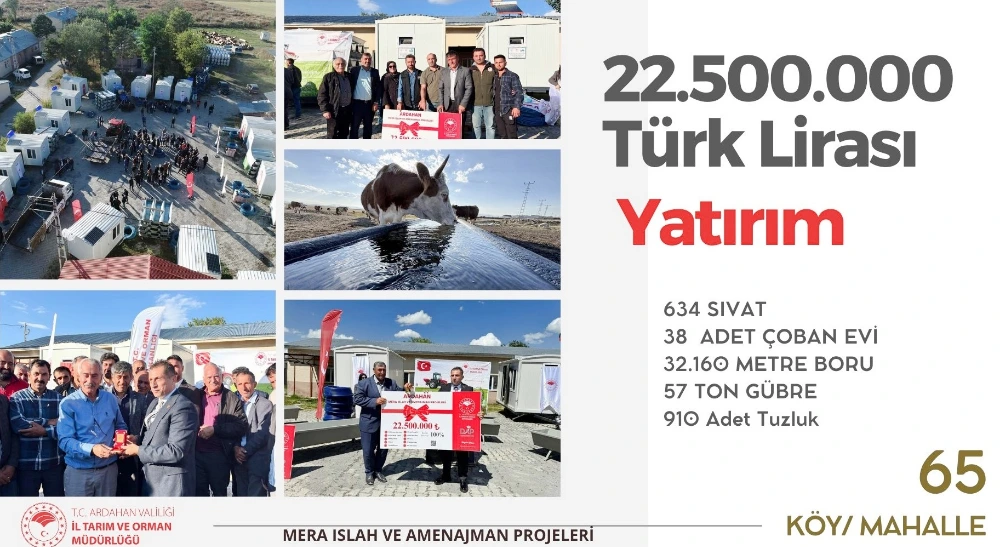 Projeler kapsamında toplam 22,5 milyon TL tutarında yatırım yapılarak 65 köy ve mahallede hayvancılıkla uğraşan üreticilerin hizmetine çok sayıda altyapı desteği sunuldu.