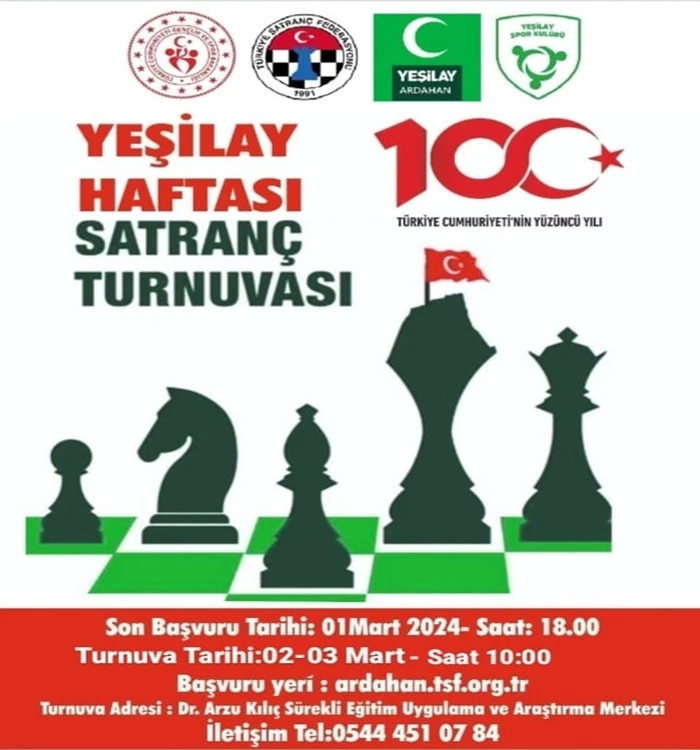 Türkiye Satranç Federasyonu Ardahan İl Temsilciği ve Ardahan Gençlik ve Spor İl Müdürlüğü iş birliğiyle Yeşilay Haftası etkinlikleri kapsamında satranç turnuvası düzenlenecek.