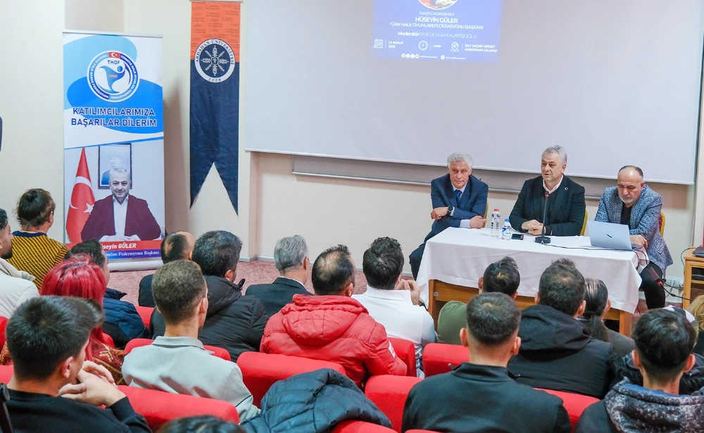 Panelin davetli konuşmacısı olan Türk Halk Oyunları Federasyonu Başkanı Hüseyin Güler, Türk halk oyunlarının güncel durumu, kültürel aktarım süreçleri, kurumsallaşma çalışmaları ve gelecek perspektifleri hakkında kapsamlı bilgiler paylaştı. Güler, halk oyunlarının ulusal ve uluslararası düzeyde tanıtımının önemine dikkat çekerek, bu alanda yürütülen kurumsal çalışmalar hakkında katılımcıları bilgilendirdi.