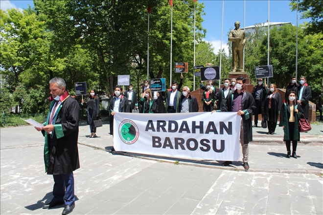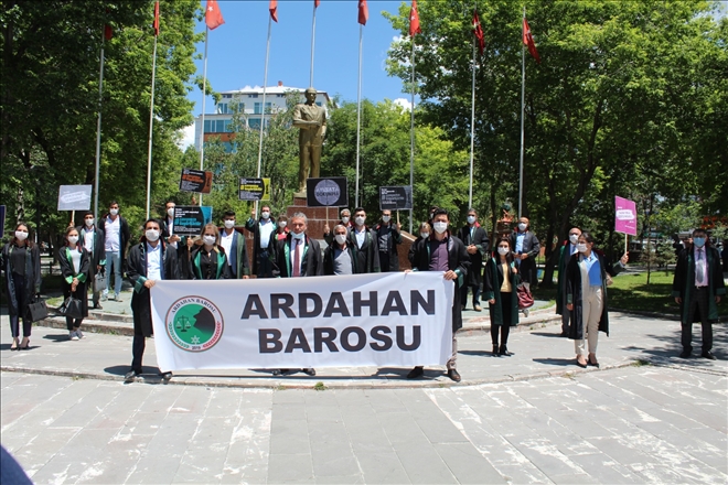 Avukatlar, Ardahan Barosu´nun çağrısıyla bugün Milli Egemenlik Parkındaki Atatürk anıtının önünde bir araya geldi. Pankartlarla alana gelen avukatlar, burada maske taktı, sosyal mesafe kuralına uymaya özen gösterdi.