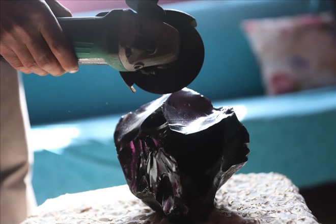 Elektrikli spiral ile kesmeye denediğini ve hiçbir şekilde kesilmediğini söyleyen Atan, ?Denemek amaçlı spiral ile kesmeye çalıştım ama spiral kayıp kesmiyor. Bir de bu taşı güneşe tuttuğum zaman köşelerinde Gökkuşağı gibi 3-4 ayrı renk oluşuyor. Taşa baktığınızda içerisinde siyah kaburgalar gözükürken güneşe tuttuğumuzda köşe kısımlarından Gökkuşağını andıran rengarenk görüntüler oluşuyor. Parlak ve siyah olan bu taşı araştırdığımda sentetik ham elmas olarak gözüküyor´´ diye konuştu.
