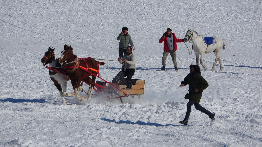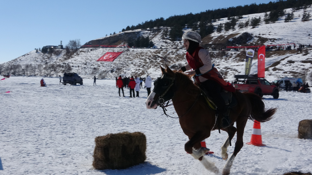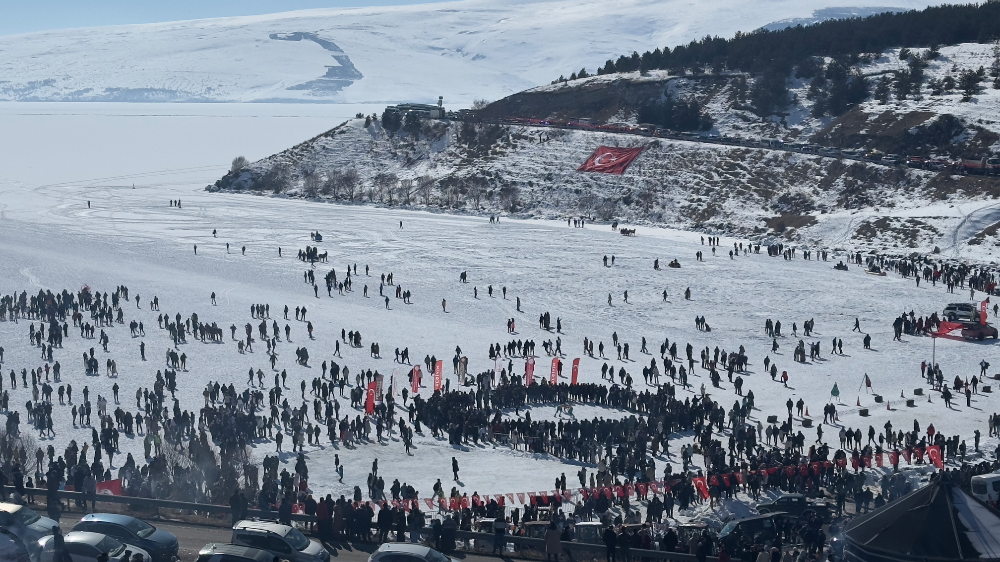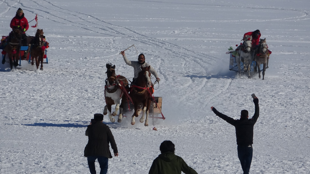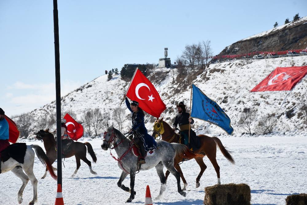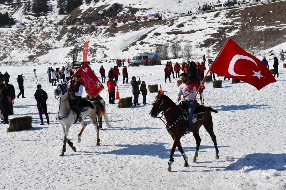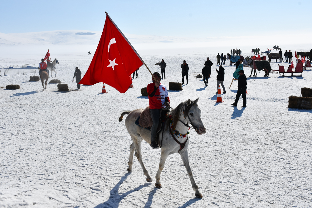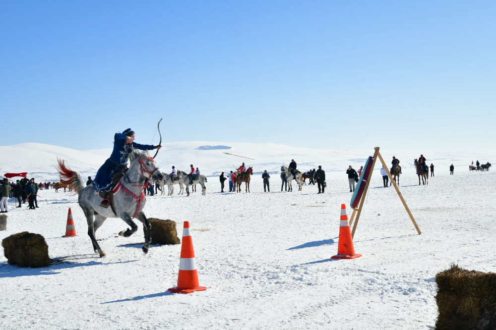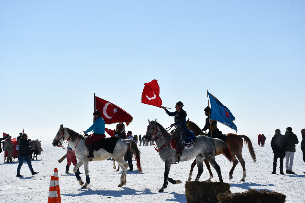 50 santimetre buz üzerinde gerçekleştirilen '9'uncu Çıldır Gölü Altın At Kristal Buz Festivali'nde atlı kızak, rahvan at yarışları, atlı okçuluk yarışı, cirit, buz pateni, kayak yarışları ve çeşitli etkinlikler düzenlendi.