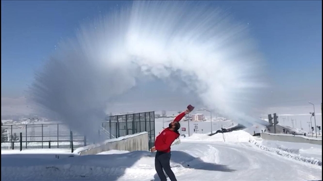 Türkiye´nin en soğuk illeri arasında bulunan Ardahan günlerdir soğuk havanın etkisi altında. Buz kente dönen Ardahan´ın Göle ilçesinde soğuk havanın ne kadar etkili olduğunu göstermek isteyen vatandaşlar havaya sıcak su serperek test etti. Havaya serpilen suyun yere buz tanecikleri olarak düştüğü gözlemlendi.