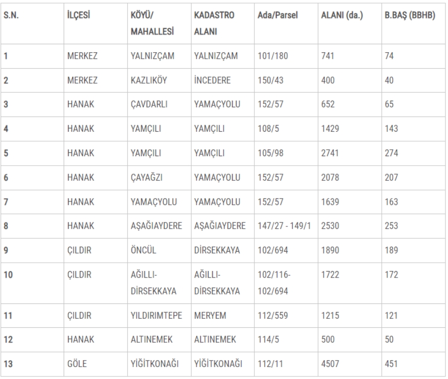İhale kapsamında, Ardahan İli Merkez İlçe Yalnızçam Köyü ve Kazlıköy Köyü, Hanak İlçe; Çavdarlı Köyü, Yamçılı Köyü (108/5), Yamçılı Köyü (105/98), Çayağzı Köyü, Yamaçyolu Köyü, Aşağıaydere Köyü, Altınemek Köyü, Çıldır İlçe; Öncül Köyü, Ağıllı-Dirsekkaya Köyü, Yıldırımtepe Köyü ve Göle İlçe Yiğitkonağı Köyünün meraları üreticilerin kullanımı için ihale edilerek kiralandı.