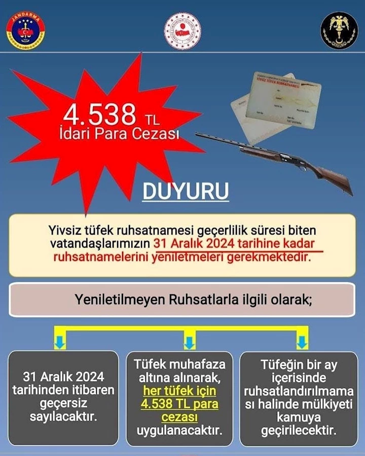 Para cezası: Ruhsatlarını yeniletmeyen vatandaşlar için, tüfeğin muhafaza altına alınması ve her tüfek için 4.538 TL para cezası uygulanacak.