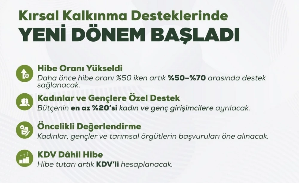 Yeni karar kapsamında kırsal kalkınma yatırımlarında hibe oranları %70’e kadar yükseltildi. Ayrıca kırsal kalkınma bütçesinin en az %20’sinin kadın ve genç girişimcilere ayrılacağı belirtildi. Başvuru süreçlerinde kadınlar, gençler ve birinci derece tarımsal örgütlere öncelik tanınacağı ifade edildi.