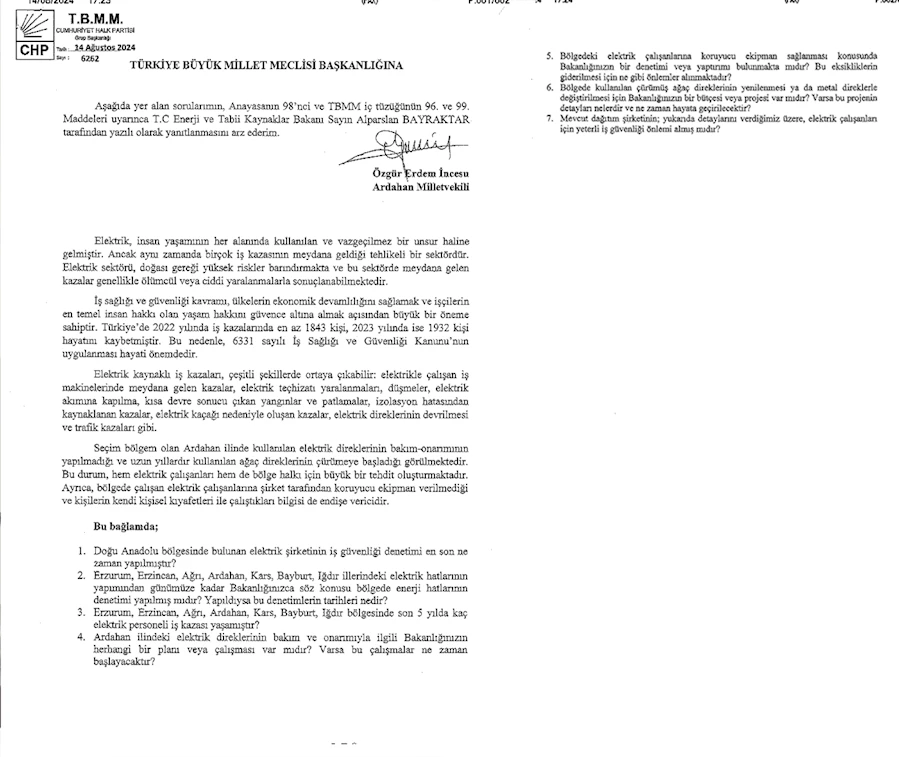 CHP Ardahan Milletvekili Özgür Erdem İncesu, elektrik ile ilgili Enerji ve Tabii Kaynaklar Bakanı Alparslan Bayraktar’ın cevaplaması istemiyle 7 maddelik soru önergesi verdi.