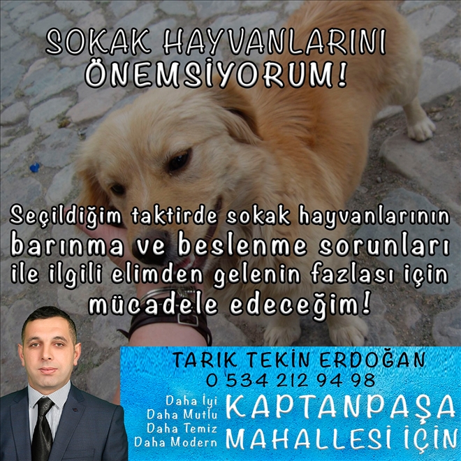 Muhtar adayı Erdoğan, ?BİR ÖĞRENCİMİZİDE SEN OKUT KAMPANYASI? başlatarak muhtarlığın verdiği bütün imkânları seferber ederek ilgili kurum kuruluşlara bağlantı kuracağım. Bunun yanında sokak hayvanlarının barınma ve beslenmesi önemsiyorum. Bir diğer projemizde ihtiyaç sahibi vatandaşların yanında olarak ihtiyaçlarını ilgili mercilerle görüşerek karşılayacağız dedi. Tarık Tekin Erdoğan, çıktığımız bu yolda hepinizin dualarını ve desteğini bekliyorum? açıklamasında bulundu.Haber: Bedrettin Şuay