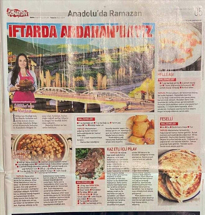 Ardahan ilimize tam sayfa yer veren Sabah Gazetesinde çıkan haber: İdilika´nın Mutfağı´nda bu iftarda Ardahan sofrasına konuk oluyoruz. Doğu Anadolu Bölgesi´nin kuzeyinde bulunan ve Karadeniz Bölgesi ile sınır olan Ardahan, bulunduğu coğrafi şartlar itibariyle zengin bir mutfak kültürüne sahiptir... Bakalım bizleri ne lezzetler bekliyor..
