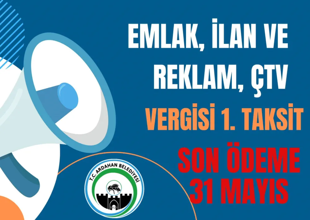 Ardahan Belediyesi, 2024 yılına ait vergi ödemelerinin birinci taksitinin son ödeme tarihini 31 Mayıs Cuma günü olduğunu hatırlattı.