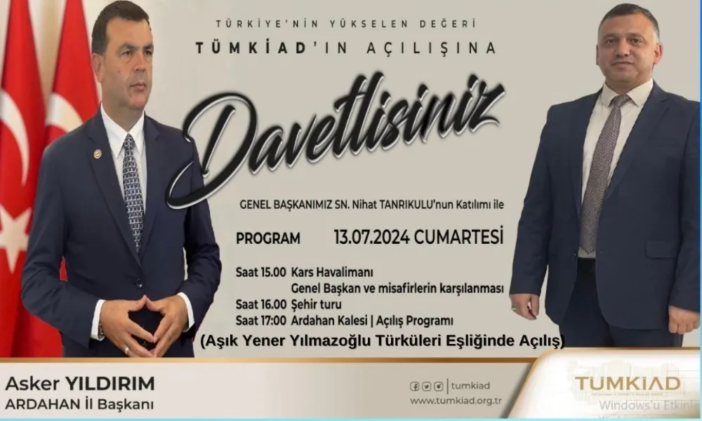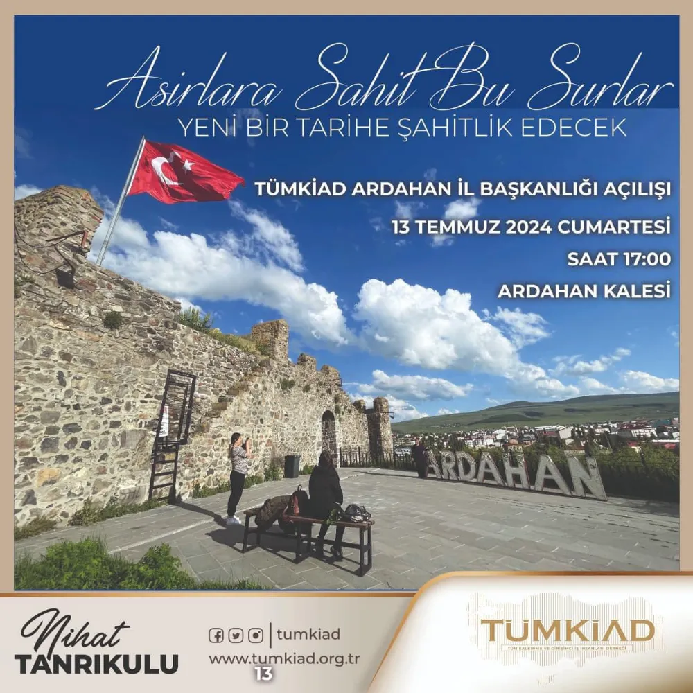 Ardahan İl Başkanlığının açılışı TÜMKİAD Genel Başkanı Nihat Tanrıkulu’nun katılımıyla, 13 Temmuz Cumartesi günü Ardahan Kalesinde yapılacak.