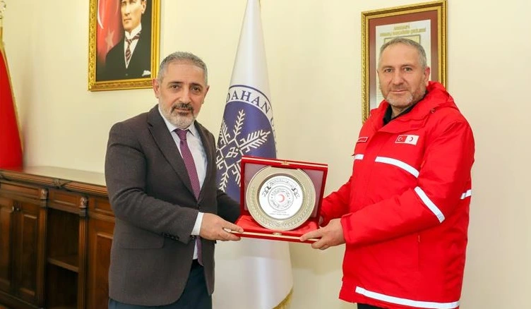 Türk Kızılay Ardahan Şube Başkanı Özcan Şentürk ve beraberindeki şube çalışanı Mustafa Aziz Yavuz ve üye Nagihan Kıranşah, Rektör Prof. Dr. Mehmet Biber’i makamında ziyaret etti. Ziyarette Üniversitenin Sağlık Kültür ve Spor Daire Başkanı Havva Vanlı hazır bulundu.