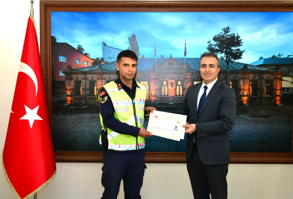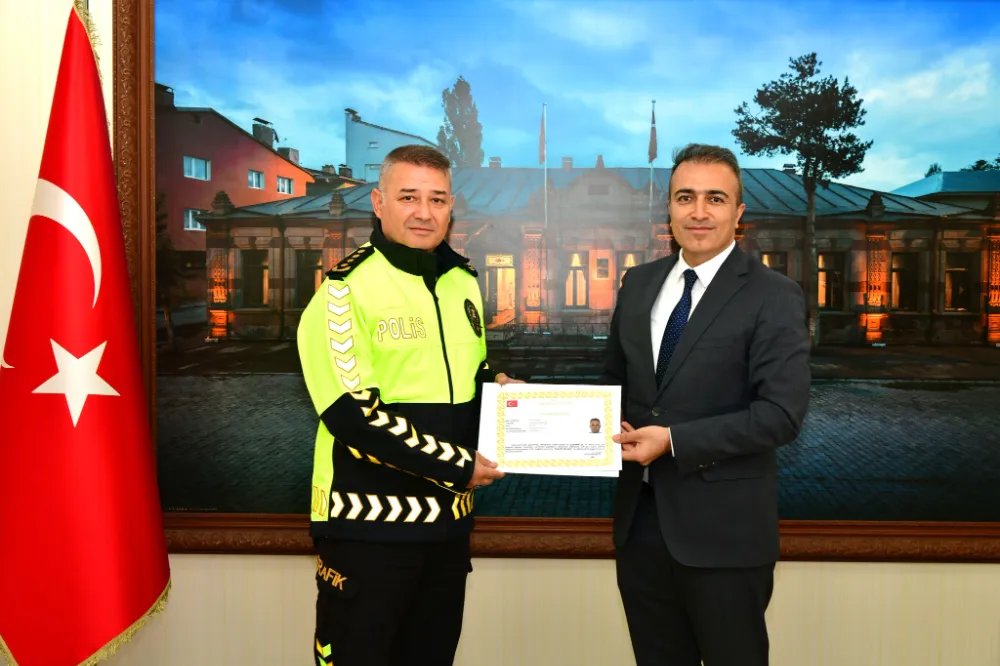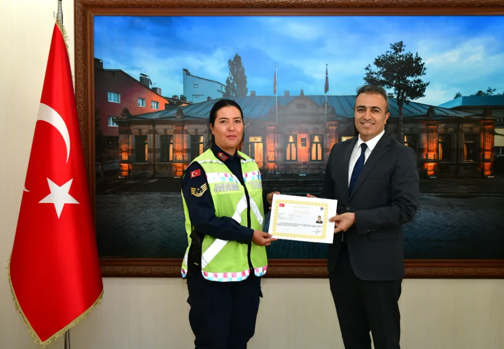 Ardahan Valisi Hayrettin Çiçek, özverili çalışma sergileyen trafik personellerini başarı belgesiyle ödüllendirdi.