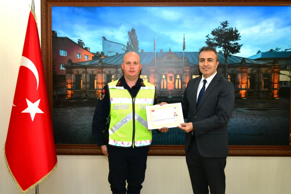 Vali Çiçek, vatandaşların can ve mal güvenliğinin sağlanması ve trafik konusunda bilinçlendirilmesi adına özverili çalışmalarda bulunan İl Emniyet Müdürü Gökalp Şener, İl Jandarma Komutanı Albay Ramazan Yiğit ve görevli trafik personelini başarı belgesi ile ödüllendirdi.