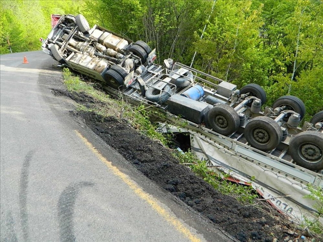 Ardahan Posof-Damal karayolunda seyir halindeyken virajı dönemeyen tır devrildi.
