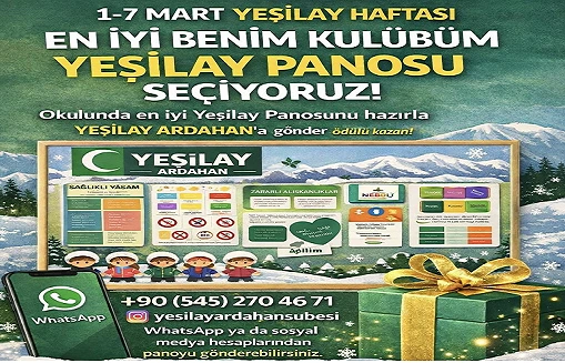 Ardahan’da, Yeşilay Ardahan Şubesi, Yeşilay Haftası dolayısıyla öğrencilere yönelik yaratıcı bir pano yarışması düzenliyor. “En İyi Benim Kulübüm Yeşilay Panosu” yarışmasıyla amaç, gençlerde sağlıklı yaşam bilincini güçlendirmek ve bağımlılıklara karşı farkındalık oluşturmak olarak açıklandı.