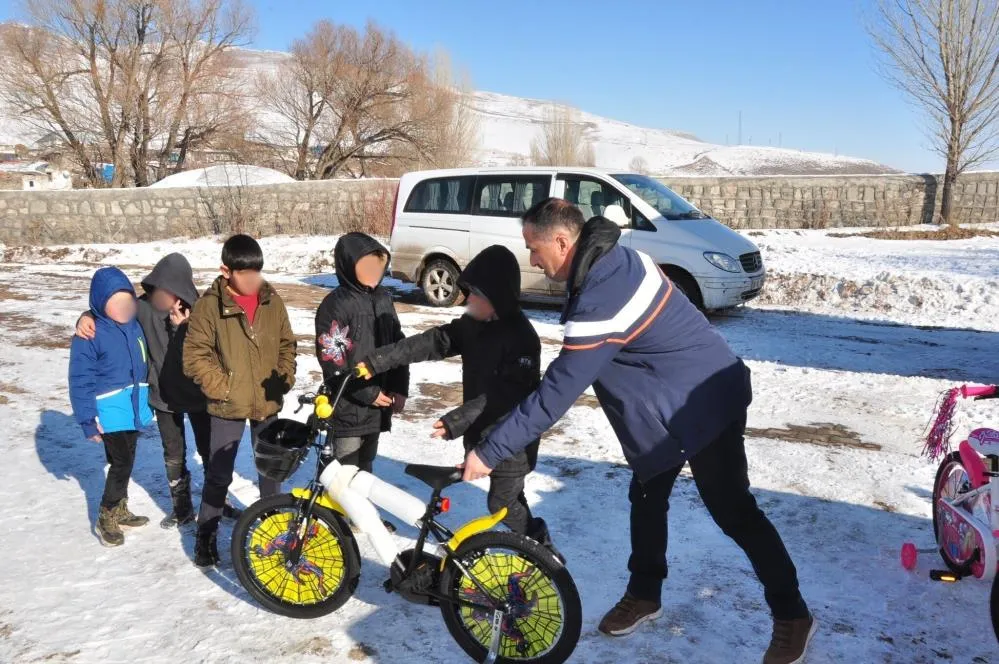 Aliağa Cumhuriyet İlkokulu'nun hayata geçirdiği "Velespitim Pırıl Pırıl" projesi kapsamında, Iğdır, Ardahan ve Kars'taki öğrencilere toplam 42 adet bisiklet hediye edildi.